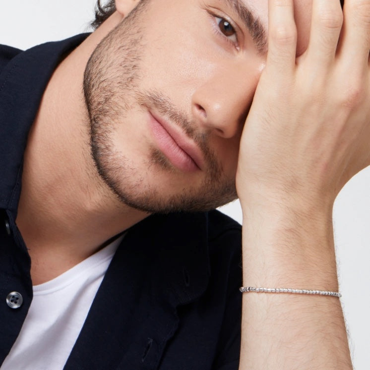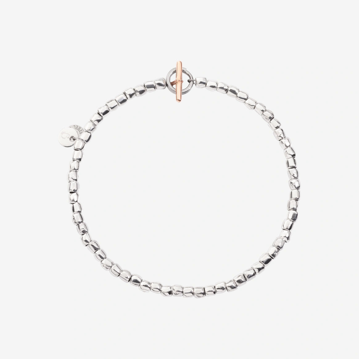 Mini granelli bracelet in 925 silver, steel chain and brisè ring, 9K rose gold t-bar, silver and steel plates.