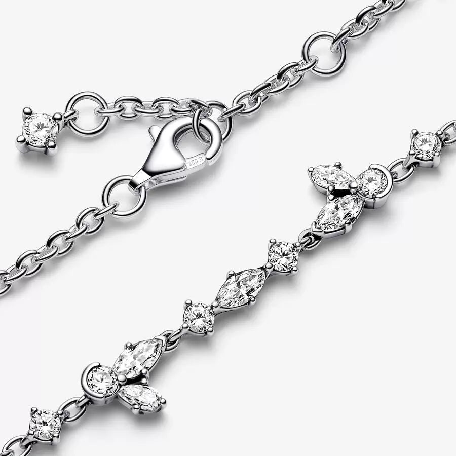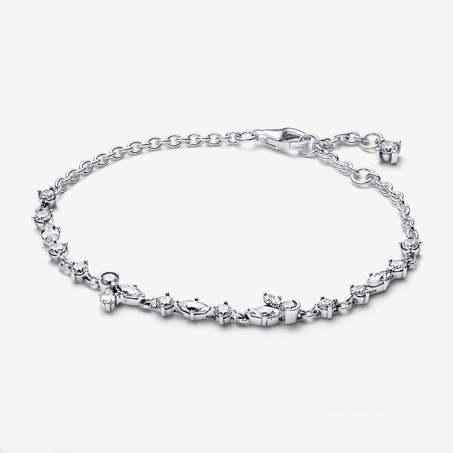 Let yourself be inspired by the splendid shapes of nature with this Herbarium Petals and Luminous Stones Bracelet. Inspired by pressed flowers and leaves, the hand-finished sterling silver bracelet is decorated with cubic zirconia stones that alternate round and marquise shapes along the middle of the chain, with two compositions of round, marquise and pear stones creating shapes inspired by the nature, fixed by two joining rings that allow them to move naturally together with the chain. The bracelet can be adjusted to three sizes.