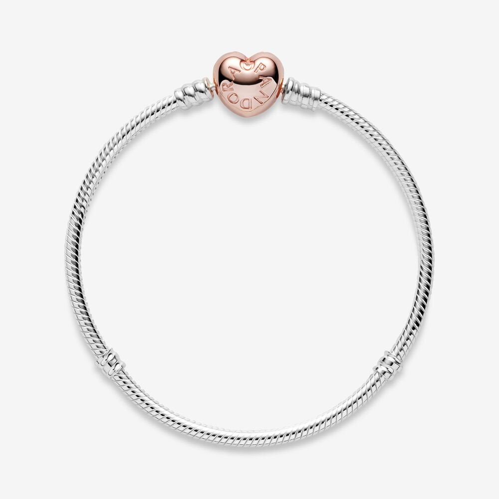Make your heart flutter with this romantic version of the most beloved Pandora charm bracelet ever. Hand-finished with a Pandora Rose heart clasp, this 925 Sterling Silver snake link bracelet is stunning worn alone, and even more spectacular when embellished with the Pandora Moments charms and clips you love most.
