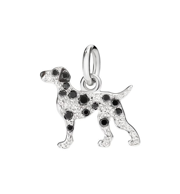 Dalmatian pendant in 18 kt white gold with white and black diamonds. Black cord included.