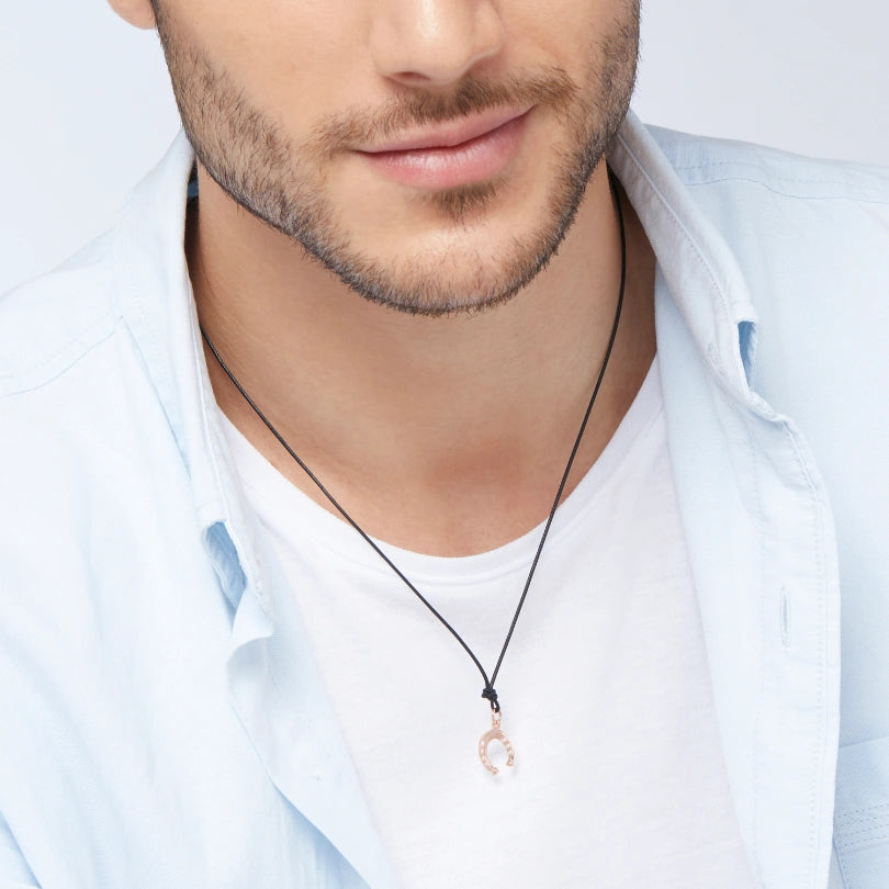 Ciondolo ferro di cavallo in oro rosa 9K. Cordino nero incluso.