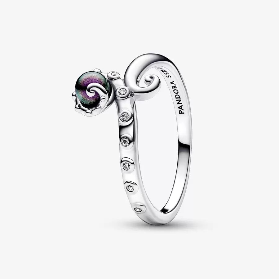 Discover a world full of treasures with the new Ursula Ring from the Disney x Pandora collection. Inspired by the mysterious power of Ursula, this ring features a luminous purple lacquered artificial pearl set between two swirling 925 Sterling Silver octopus tentacles. Sparkling stones and micro-spheres along one side of the band catch the light creating a sun-like effect reflects on the waves.