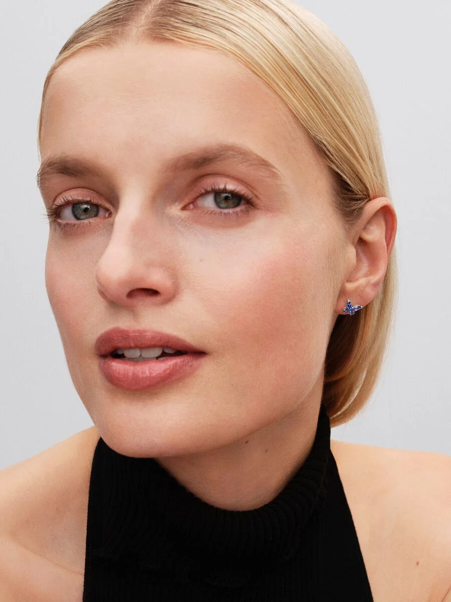 Lascia che la tua fantasia prenda il volo. Gli orecchini a lobo Farfalla in Argento Sterling 925 sono un'aggiunta vivace a ogni composizione, con cristalli blu creati dall'uomo che ricordano un cielo notturno stellato.