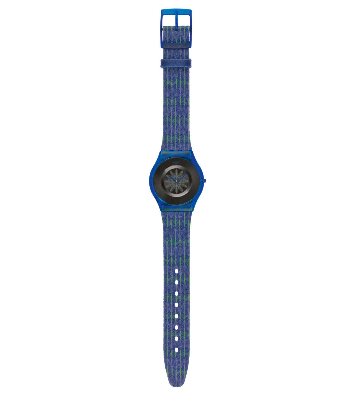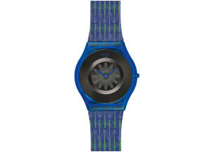 This Swatch watch has a plastic case with a diameter of 34 mm