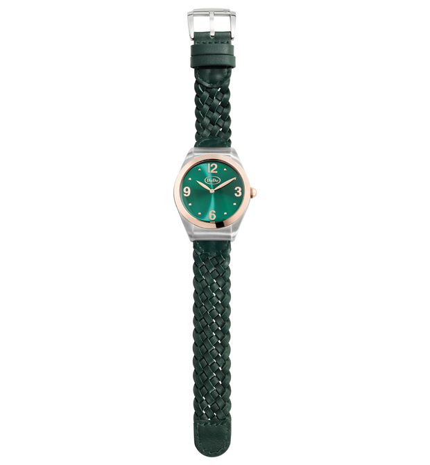 Watch with 37 mm diameter steel case and rose gold-coloured PVD bezel and crown. Green "soleil" effect dial. Fir braided leather strap with polished steel buckle.