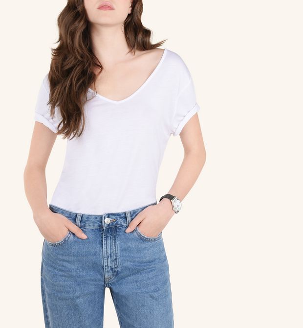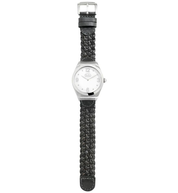 Watch with 37 mm diameter steel case with steel finishes and steel-colored hands. White enamelled dial. Anthracite woven leather strap with polished steel buckle.