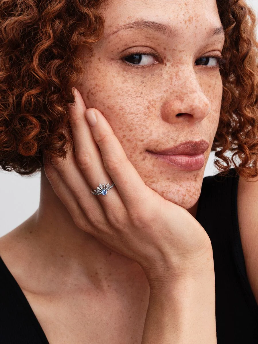 Risplendi come la Regina delle nevi. Dimostra la tua passione per Frozen Disney con questo scenografico anello in Argento Sterling 925 decorato da una composizione a forma di tiara con pietre blu e incolori.