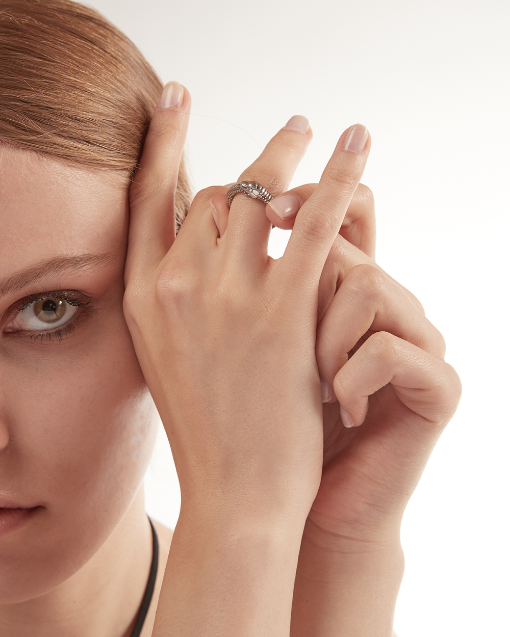 L'Anello Serpente Uroboro fa parte della Collezione Uroboro ed è realizzato in Argento 925. Come tutti i gioielli Nove25 anche questo Anello viene progettato e lavorato in Italia mediante l'utilizzo delle più moderne tecnologie e rifinito a mano per garantirne il massimo dettaglio e la più elevata qualita'. Questo gioiello viene proposto con una finitura Brunito Lucido