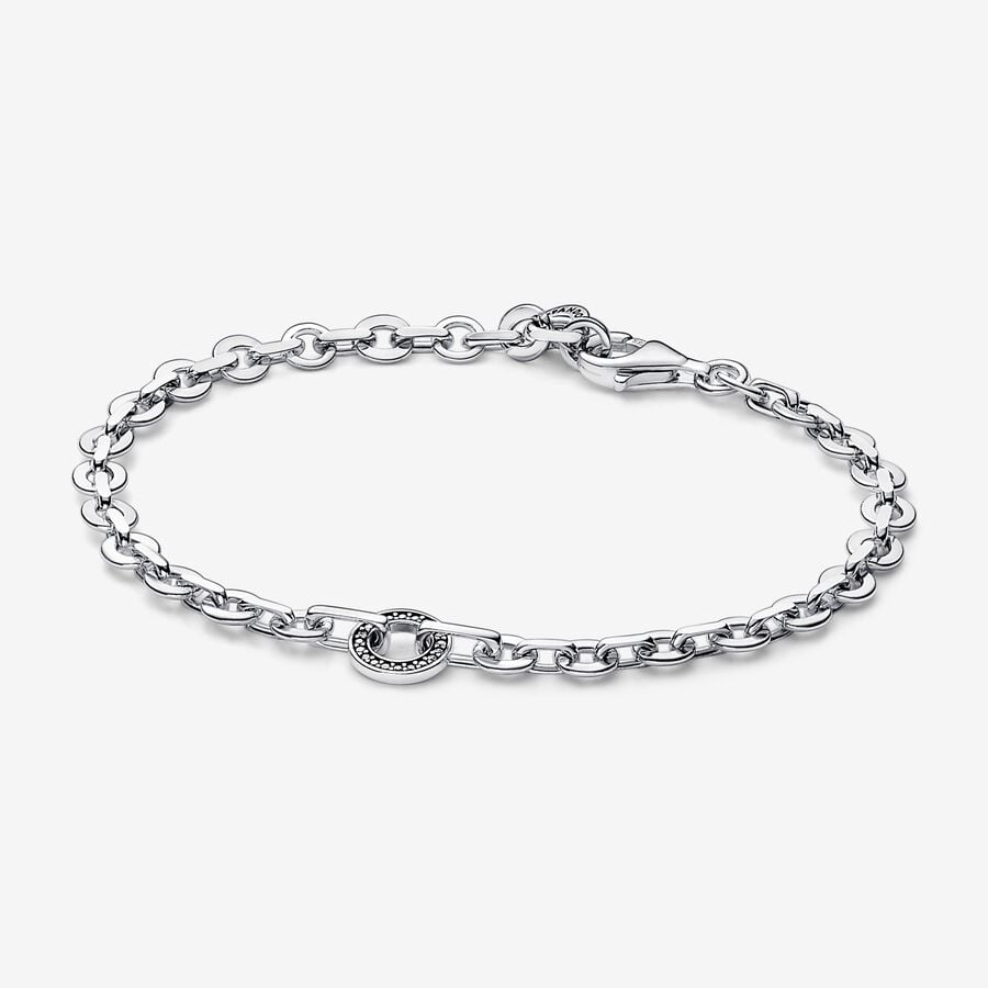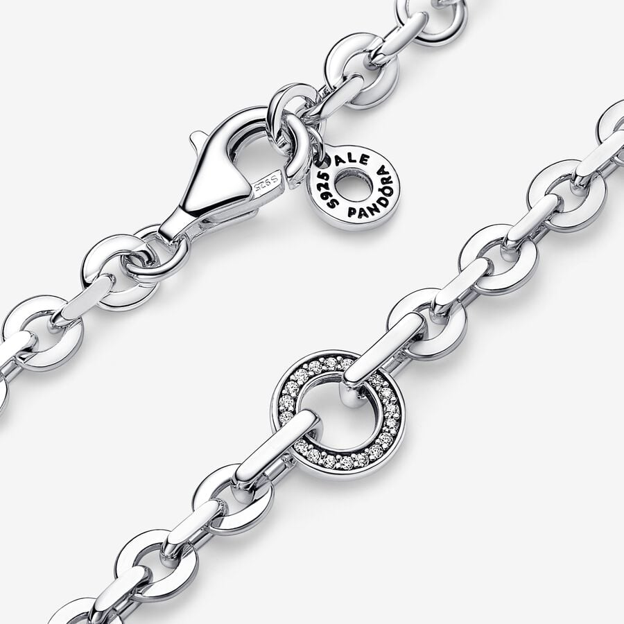 Crea la tua composizione unica con il Bracciale Cerchio Pavè. Realizzato in Argento Sterling 925, il bracciale presenta una catena di maglie composta da un mix di maglie ovali e rettangolari, piatte su un lato e rotonde sull'altro. Al centro presenta un cerchio decorato da una fila di pavé incastonato con microsfere su un lato, il cerchio centrale è fissato alla catena da due maglie rettangolari che ne consentono la rotazione. Il bracciale presenta inoltre tre anelli per regolare la lunghezza.
