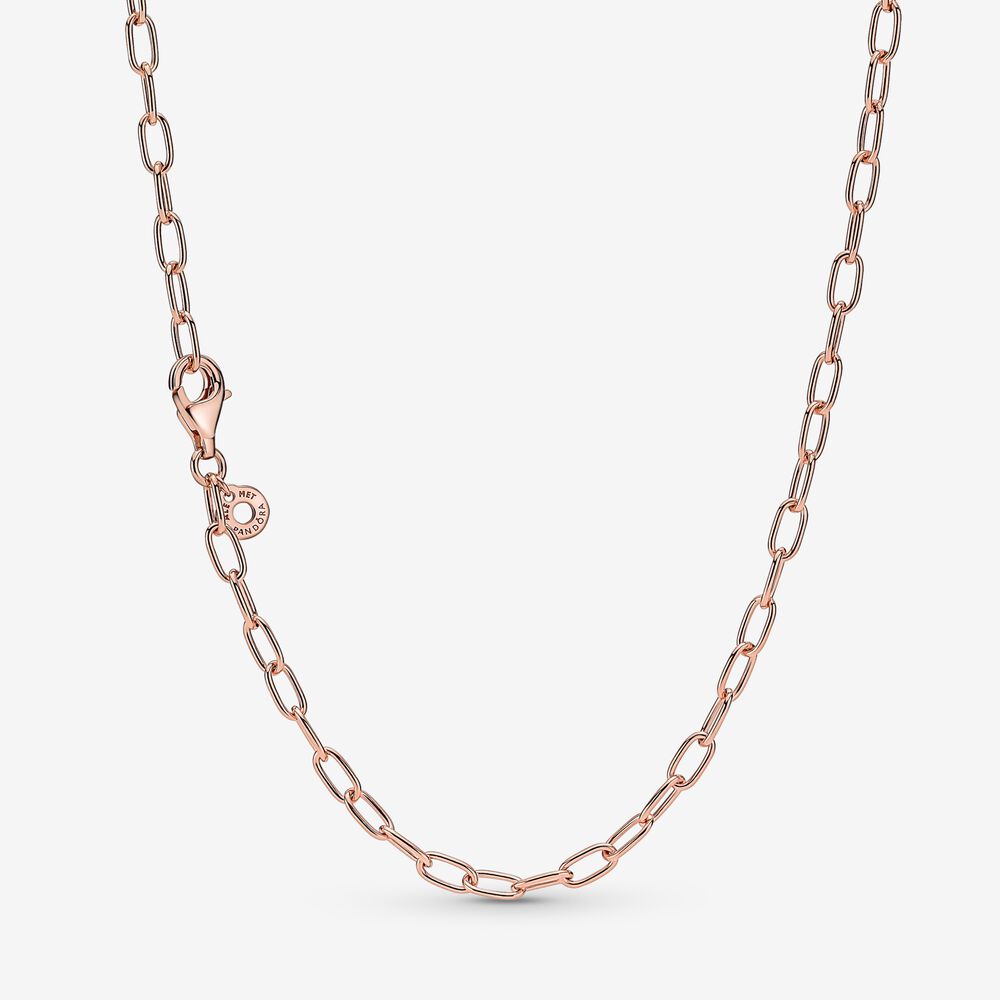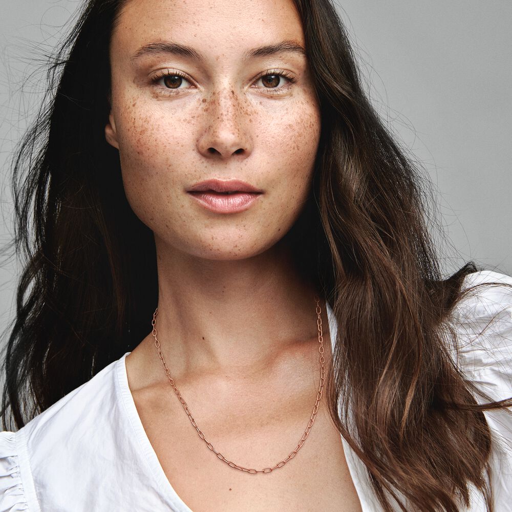 Inserisci nella tua collezione un gioiello classico con questa collana con maglie a catena. Rifinito a mano e realizzato con placcatura in oro rosa 14k, il gioiello è disponibile in una sola misura. Indossa la collana insieme a orecchini semplici con placcatura in oro rosa 14k per uno stile contemporaneo tono su tono. Oppure abbinala a pendenti Pandora O piccoli, medi o grandi per indossare i tuoi charm preferiti in un modo nuovo.