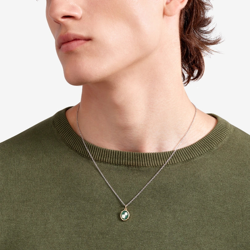 Il Cammeo di DoDo un piccolo capolavoro di arte orafa: in porcellana verde e bianca, ha una cornice ribattuta a mano in oro giallo 9K. Sul retro un’incisione con la scritta ‘Good luck’, mentre al centro del portafortuna, c’è un openwork a forma di quadrifoglio