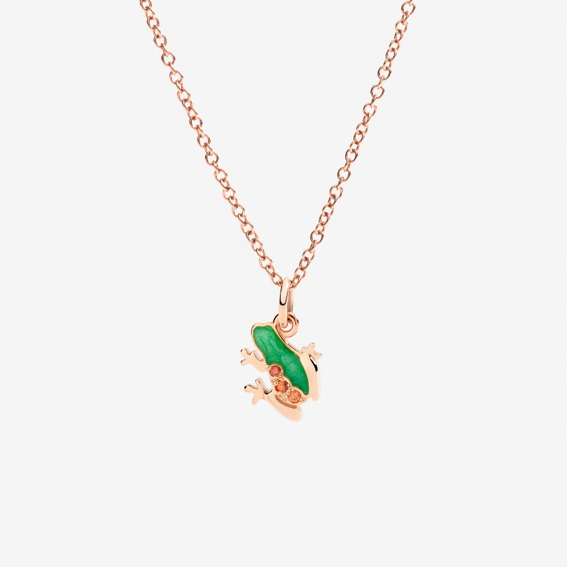 Smalto verde e zaffiri arancio trattati per il nuovo ciondolo Rana dai colori brillanti e tropicali. In oro rosa 9K, la Rana ha una zampa nascosta ed una piegata, pronta a saltare in alto.