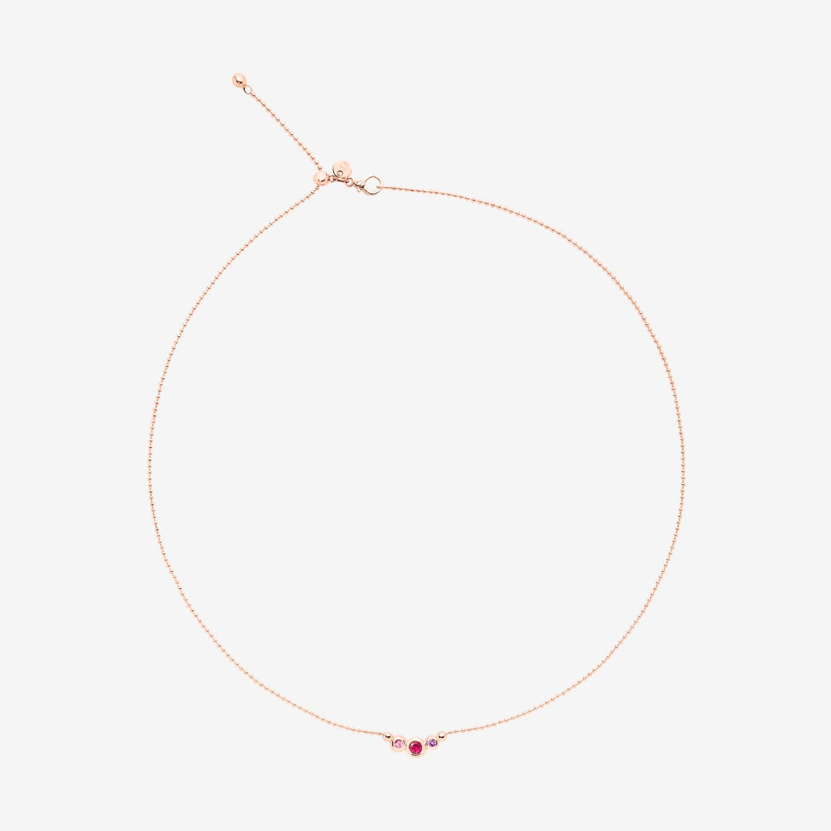 Collana Bollicine in oro rosa 9K con 1 zaffiro rosa (ct 0.03), 1 rubino (ct 0.08) e 1 ametista (ct 0.01).