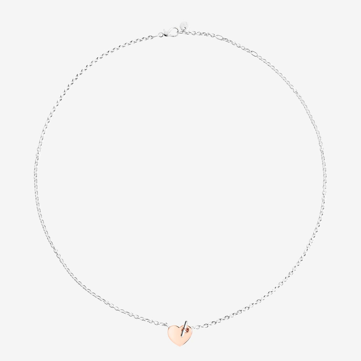Collana Cuore con catena in argento 925 e charm cuore in oro rosa 9K con dettaglio t-bar in argento 925.