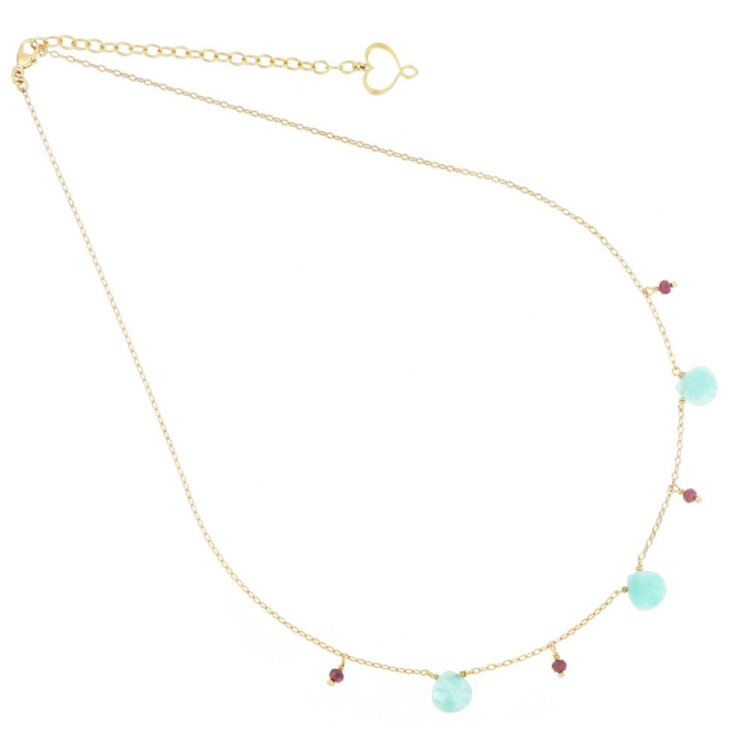 Il girocollo può essere regolato da un minimo di 37 cm fino ad un massimo di 44 cm e presenta quattro pietre di granato e tre gocce di amazzonite celeste.