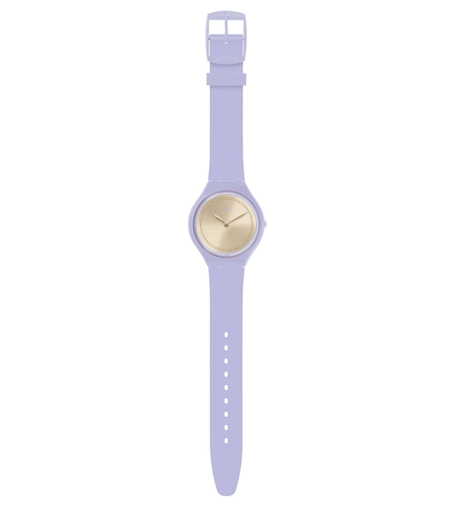 Custodia in plastica color lavanda con cinturino in silicone color lavanda. Lunetta fissa. Quadrante color oro con lancette color oro. Tipo di quadrante: analogico. Movimento al quarzo. Tirare / spingere la corona. Forma della cassa rotonda, dimensione della cassa: 36,80 mm, spessore della cassa: 5,40 mm. Chiusura con fibbia. Resistente all'acqua a 30 metri / 100 piedi. Funzioni: ore, minuti. Stile orologio casual. Orologio da donna Swatch Skinlavande lavanda SVOV100.